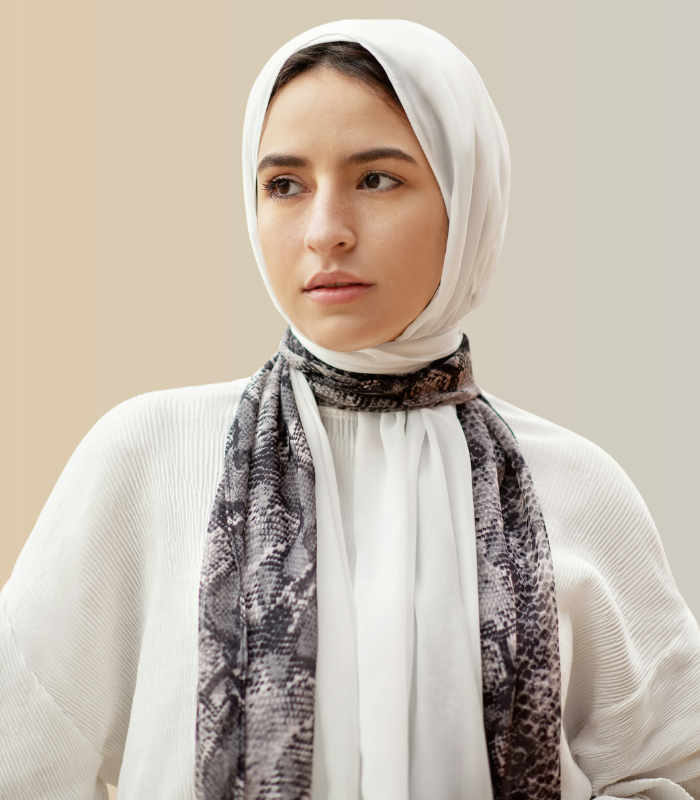 A soft white hijab paired with a textured scarf—minimal, graceful, and perfect for everyday sophistication.