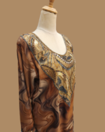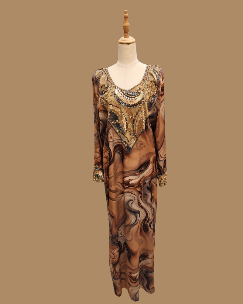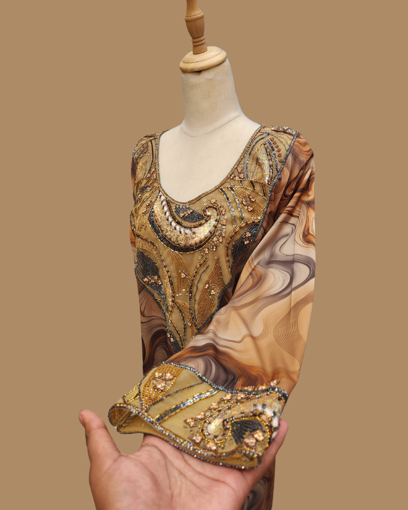 Indulge in timeless luxury with our Mkhaweer, thoughtfully made to order using premium custom-print materials. Designed to blend elegance with all-day comfort, this piece is tailored for a graceful and flattering fit.