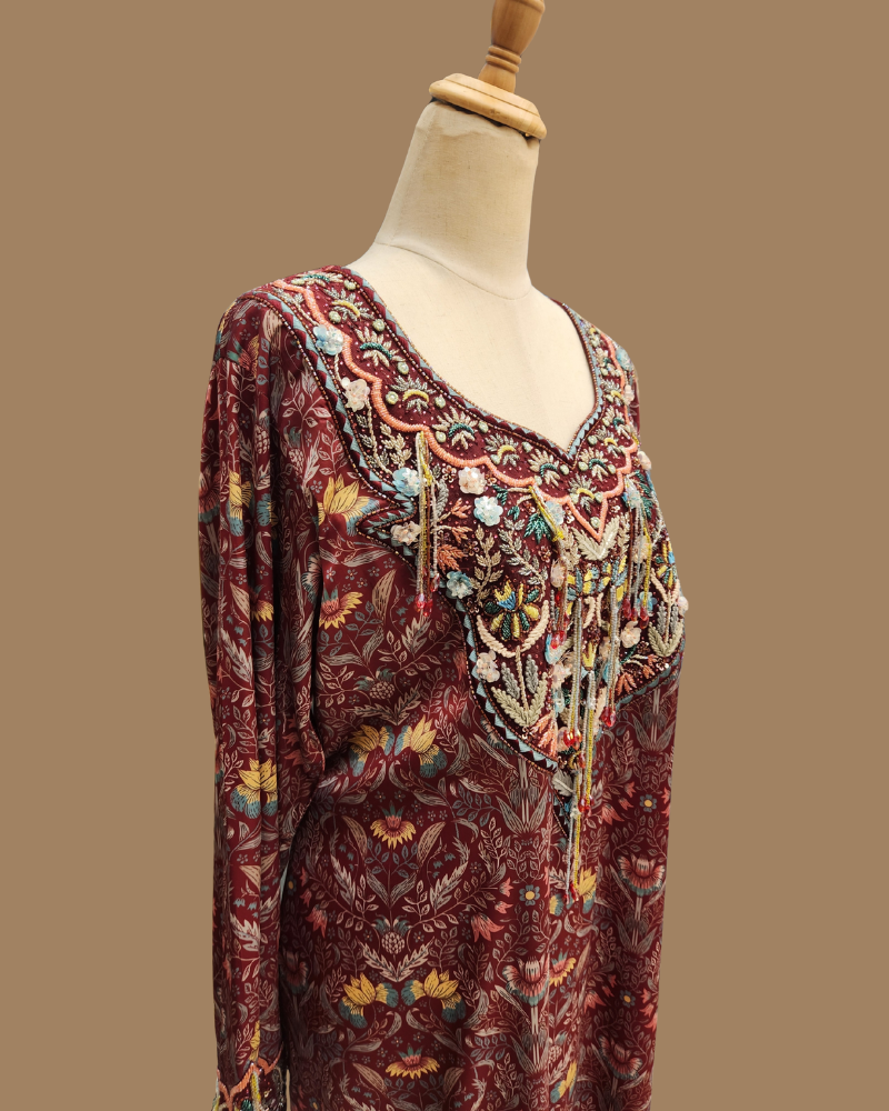 Indulge in timeless luxury with our Mkhaweer, thoughtfully made to order using premium custom-print materials. Designed to blend elegance with all-day comfort, this piece is tailored for a graceful and flattering fit.