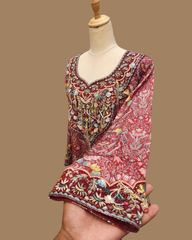 Expertly handcrafted, the fabric features 3D floral detailing, YHB crystals, and intricate handwork, adding depth, sparkle, and refined sophistication. Elevate your wardrobe with a statement Mkhaweer that reflects exceptional craftsmanship and style.